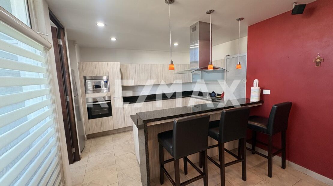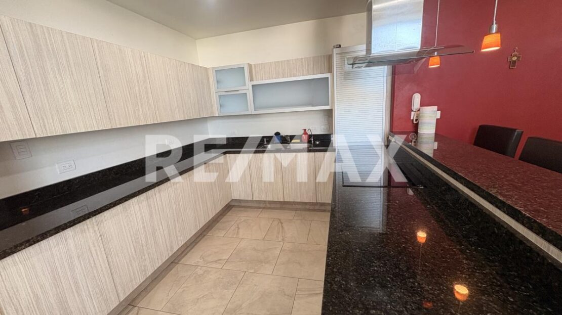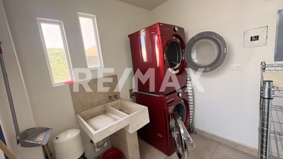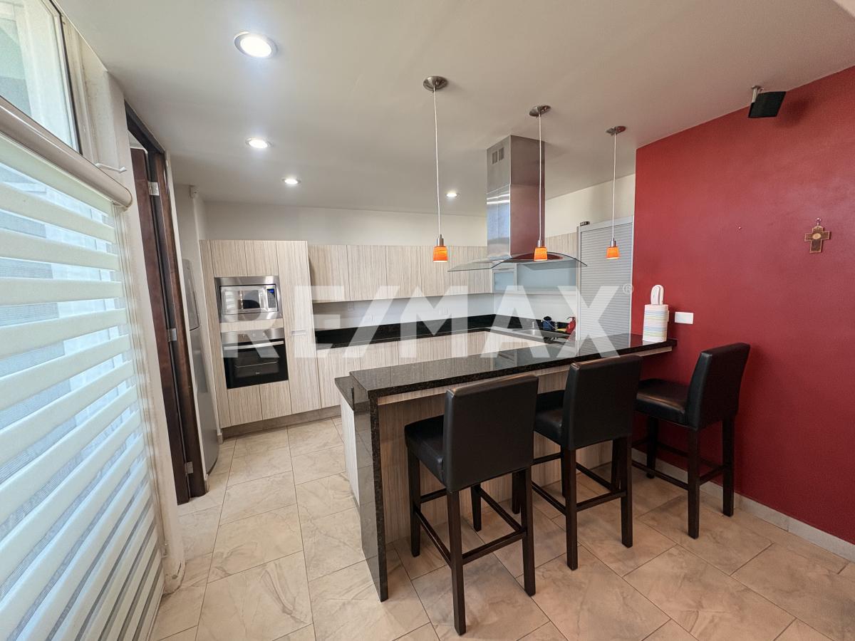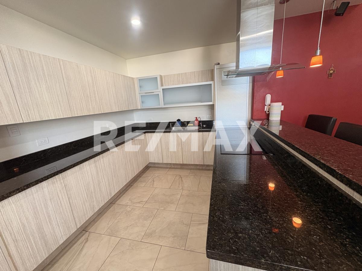 Planta Baja Cochera sin techar para 2 vehiculos, Sala-Comedor equipada con T.V. con home theater, Cocina con barra de granito equipada con Refrigerador, parrilla electrica, horno y microondas, Medio baño para visitas, Cuarto de lavado con lavadora y secadora